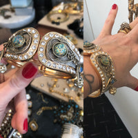 Hinged Diamond Dust Cuff, Mock Opal Celtic Emblems, Antique Pendants.